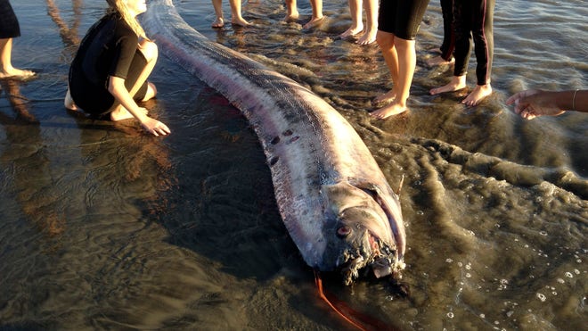 This time the rare, snakelike oarfish washed up Friday afternoon in Oceanside.