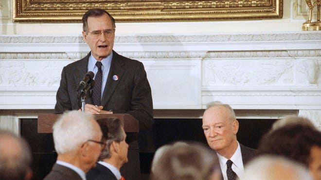 FILE - In this Tuesday, March 27, 1990, file photo, U.S. President George H. Bush, standing, addresses a White House luncheon commemorating former President Dwight. D. Eisenhower's 100th birthday. At right is John S.D. Eisenhower, the former president's son. John S.D. Eisenhower, the son of a five-star general turned president who forged his own career in the U.S. Army and then chronicled the history of the American military in numerous books, died Saturday, Dec. 21, 2013. He was 91. (AP Photo/Barry Thumma, File)news3blog.blogspot.com