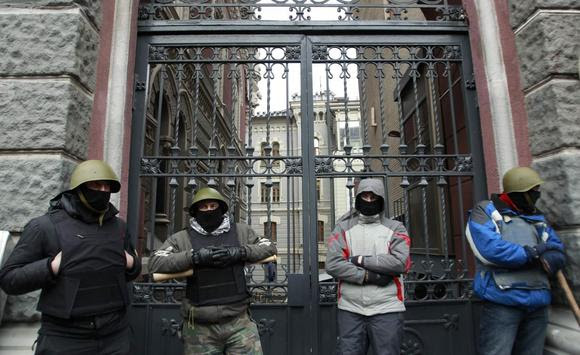 Anti-Yanukovich protesters stand guard at the national bank office in Kiev February 23, 2014.